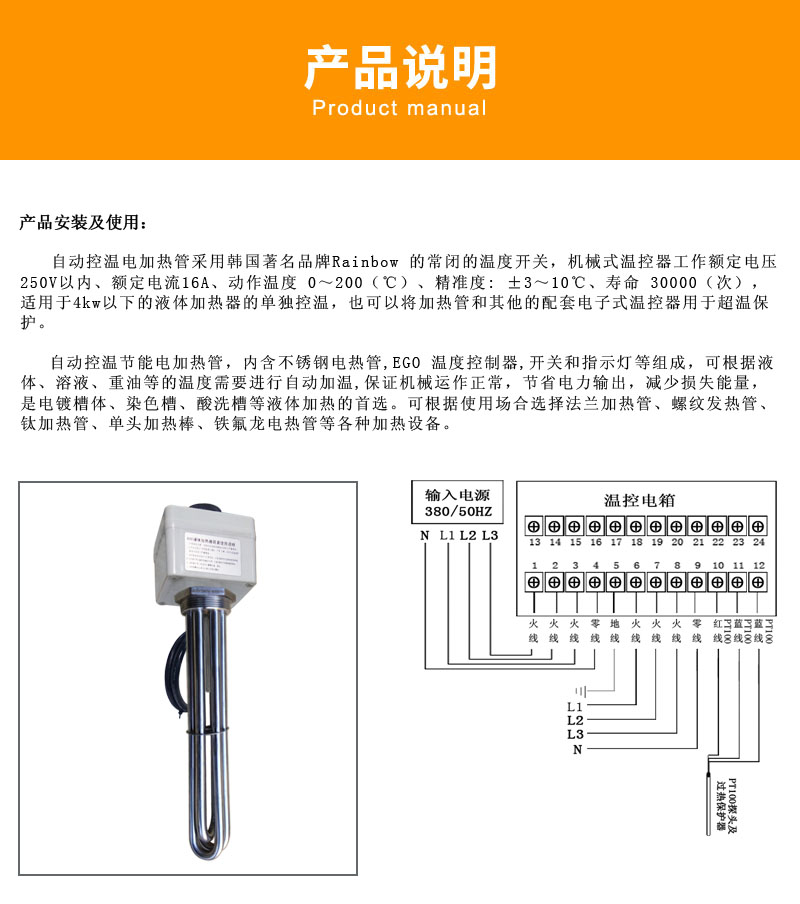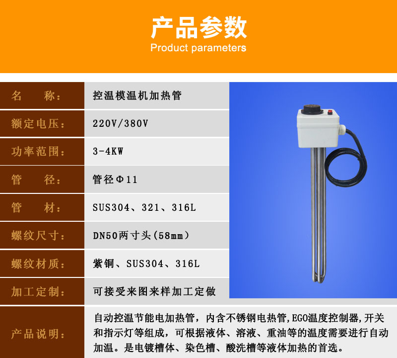自動控溫節(jié)能模溫機電加熱管,內(nèi)含不銹鋼電熱管,EGO 溫度控制器,開關(guān)和指示燈等組成,可根據(jù)液體、溶液、重油等的溫度需要進行自動加溫,保證機械運作正常,節(jié)省電力輸出,減少損失能量,是電鍍槽體、染色槽、酸洗槽等液體加熱的首選。可根據(jù)使用場合選擇法蘭加熱管、螺紋發(fā)熱管、鈦加熱管、單頭加熱棒、鐵氟龍電熱管等各種加熱設(shè)備。
