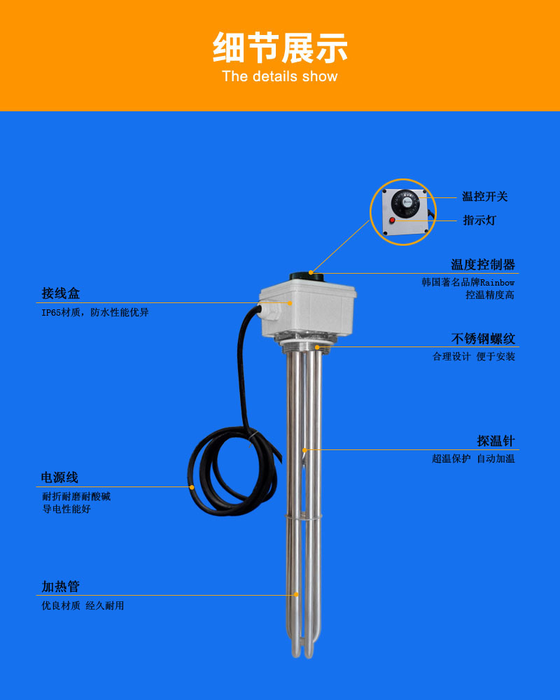 自動控溫節(jié)能模溫機電加熱管采用韓國著名品牌Rainbow 的常閉的溫度開關(guān),機械式溫控器工作額定電壓250V以內(nèi)、額定電流16A、動作溫度 0~200(℃)、精準度: ±3~10℃、壽命 30000(次),適用于4kw以下的液體加熱器的單獨控溫,也可以將加熱管和其他的配套電子式溫控器用于超溫保護。